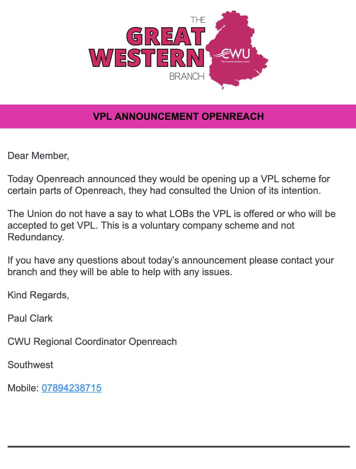 Today Openreach announced they would be opening up a VPL scheme for certain parts of Openreach, they had consulted the Union of its intention.