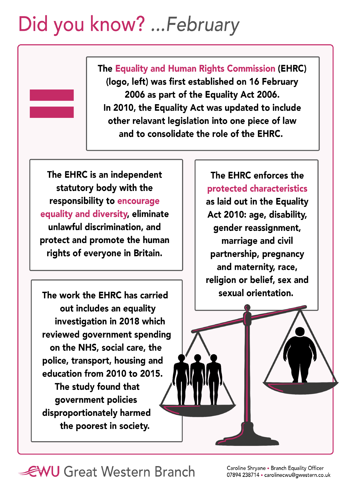 If you have any questions or concerns related to equality you can raise them with our Equality Officer - Caroline Shryane.